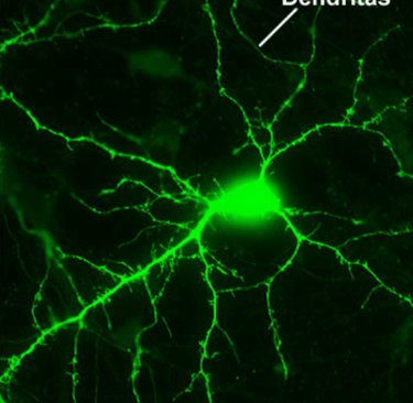 Neurona del hipocampo con sus dendritas. La parte más grande y brillante es el soma o cuerpo de la neurona. Imagen obtenida de ecured.cu