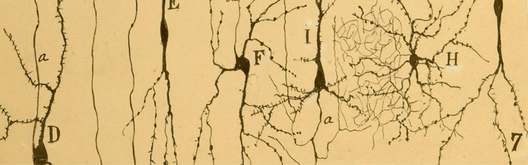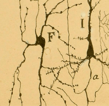 Diferentes tipos de neuronas. Las partes más gruesas son el soma de la neurona, de las que se desprenden los largos axones y estos tienen sus dendritas, las líneas más delgadas. Dibujo de Santiago Ramón y Cajal de 1904.