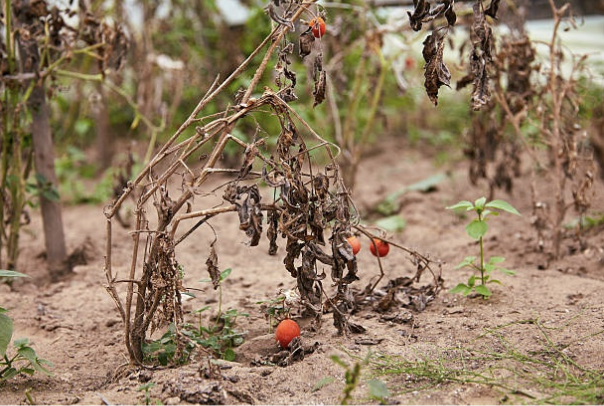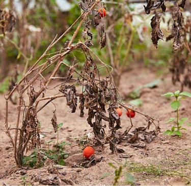 Planta de jitomate seca, ya muerta, con los últimos frutos esperando ser colectados.