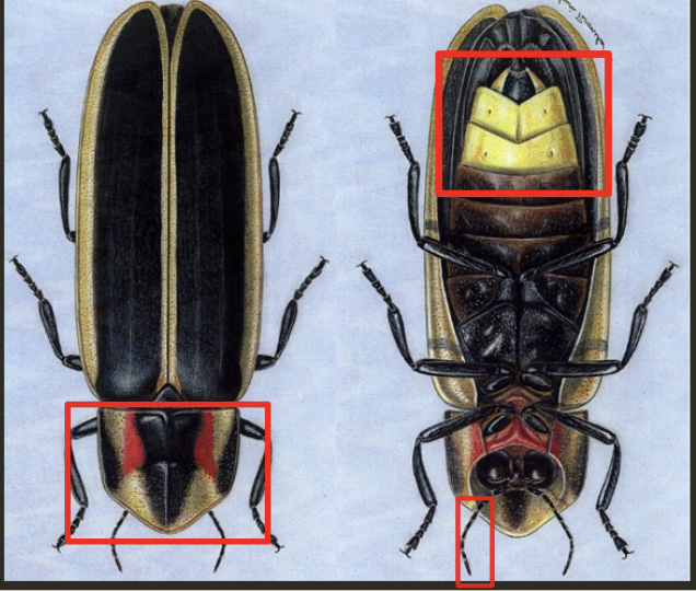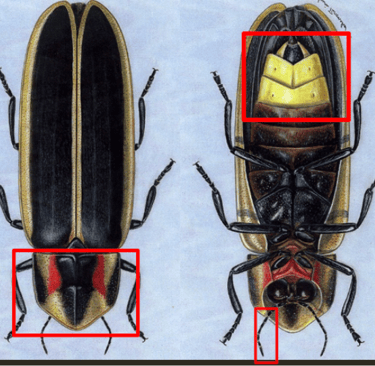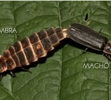 Luciérnaga macho vista desde arriba (izq.) y vista desde abajo (der.). Vemos sus últimas divisiones del abdomen brillar.