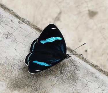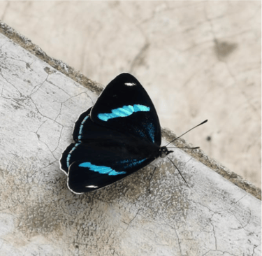 Mariposa 88 con las extendidas (color negro con azul) y sobladas sibre su dorso (blanca con rojo y negro).